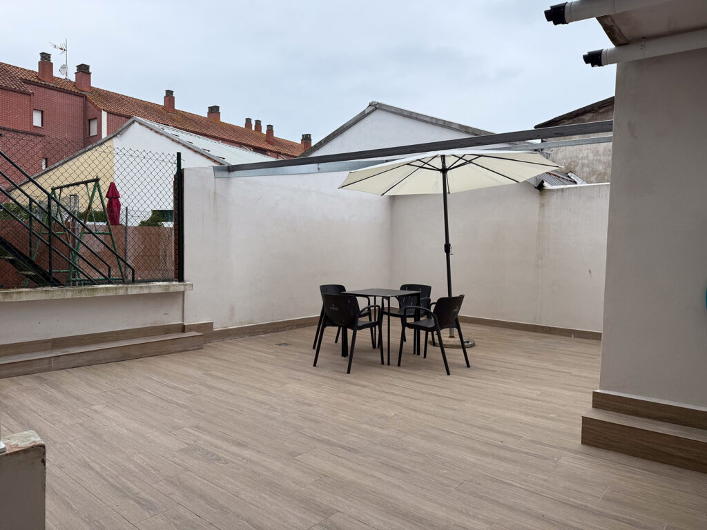Terraza exterior con mesa y sombrilla